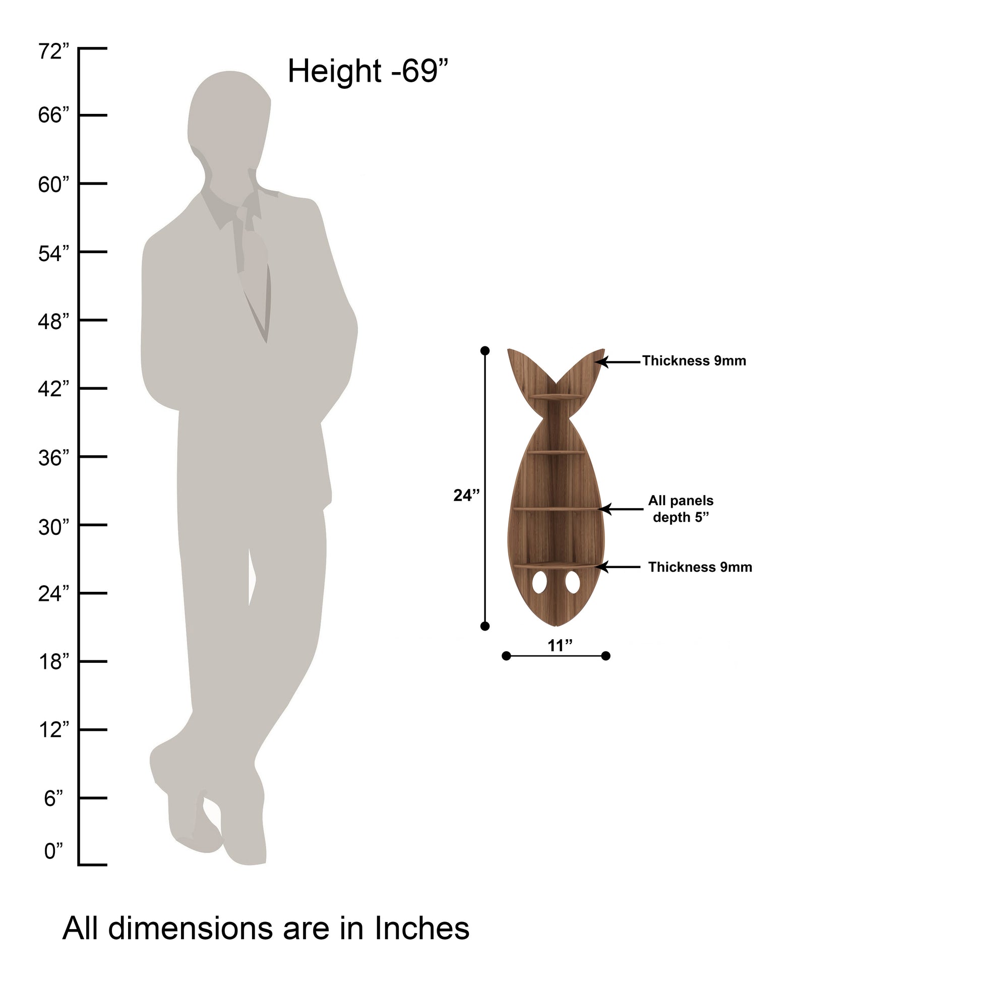 This exquisite Fish Corner Shape Wall Shelf brings a unique decor for your bare walls with a great utility. It is matte finished with walnut color, made of Indian Engineered wood. Ideal for living room, Bedroom, Study room, Kid's room. Can be used as Book shelf, wall shelf, Toy shelf, showcase etc. The package includes all accessories like nails, wall plugs, instructions needed to hang on wall