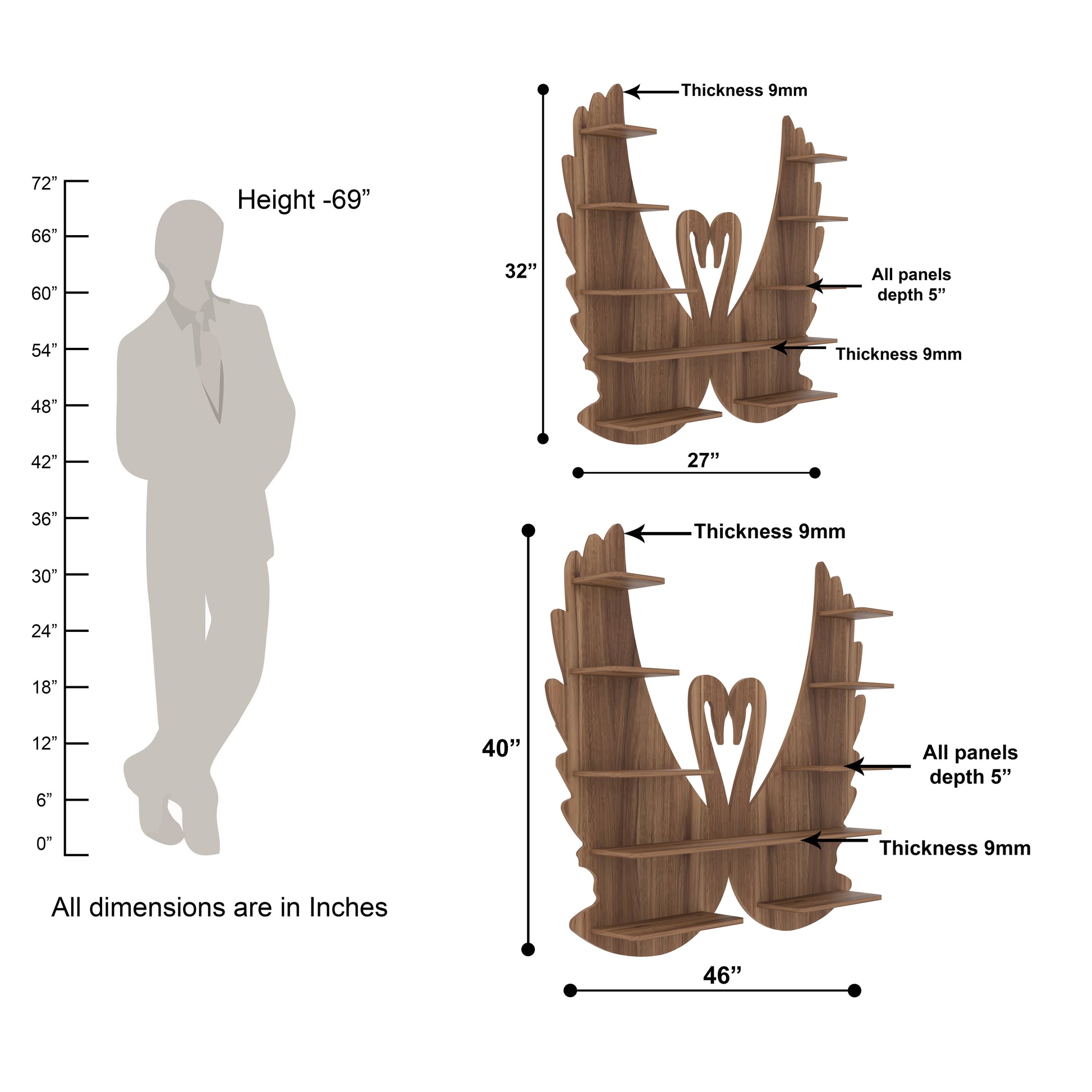 This exquisite Loving Swan Shape Wall Shelf brings a unique decor for your bare walls with a great utility. It is matte finished with walnut color, made of indian Engineered wood. Ideal for living room, Bedroom, Study room, Kid's room. Can be used as Book shelf, wall shelf, Toy shelf, showcase etc. The package includes all accessories like nails, wall plugs, instructions needed to hang on wall