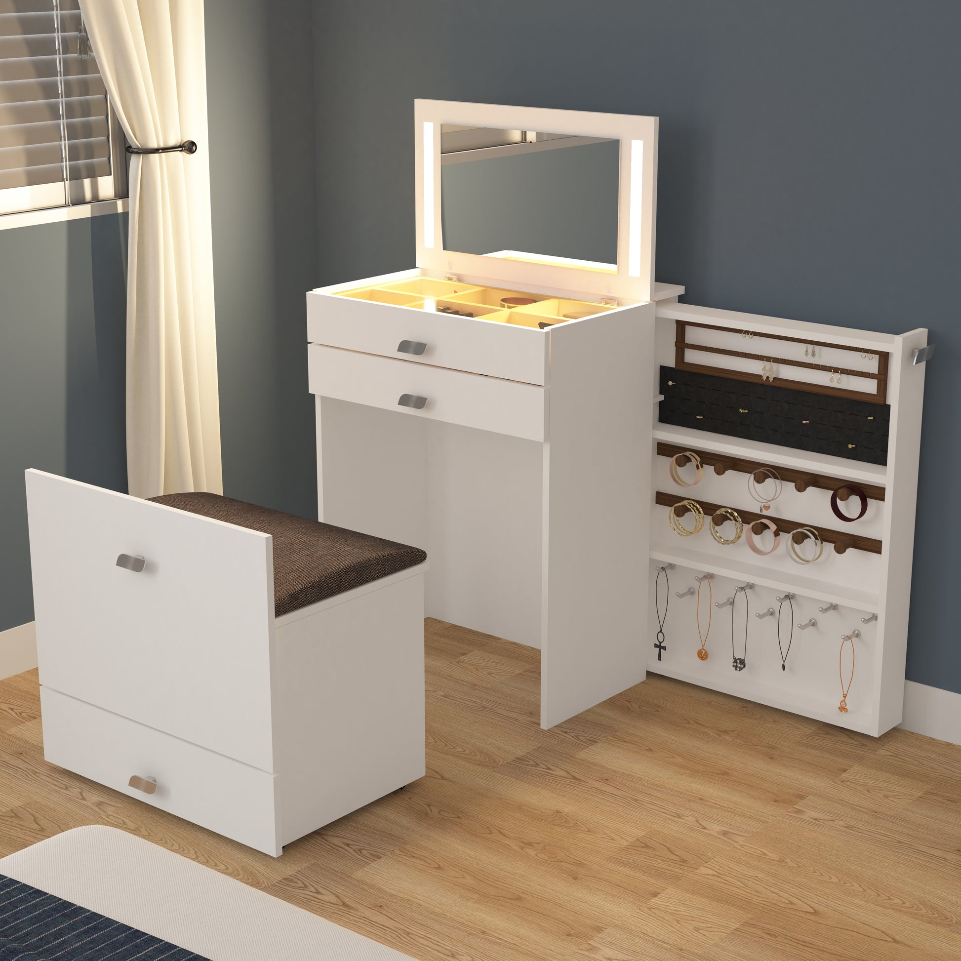 Wooden Vanity Table with Hidden Jewelry Storage, Drawers & Lift-Up Mirror (White)
