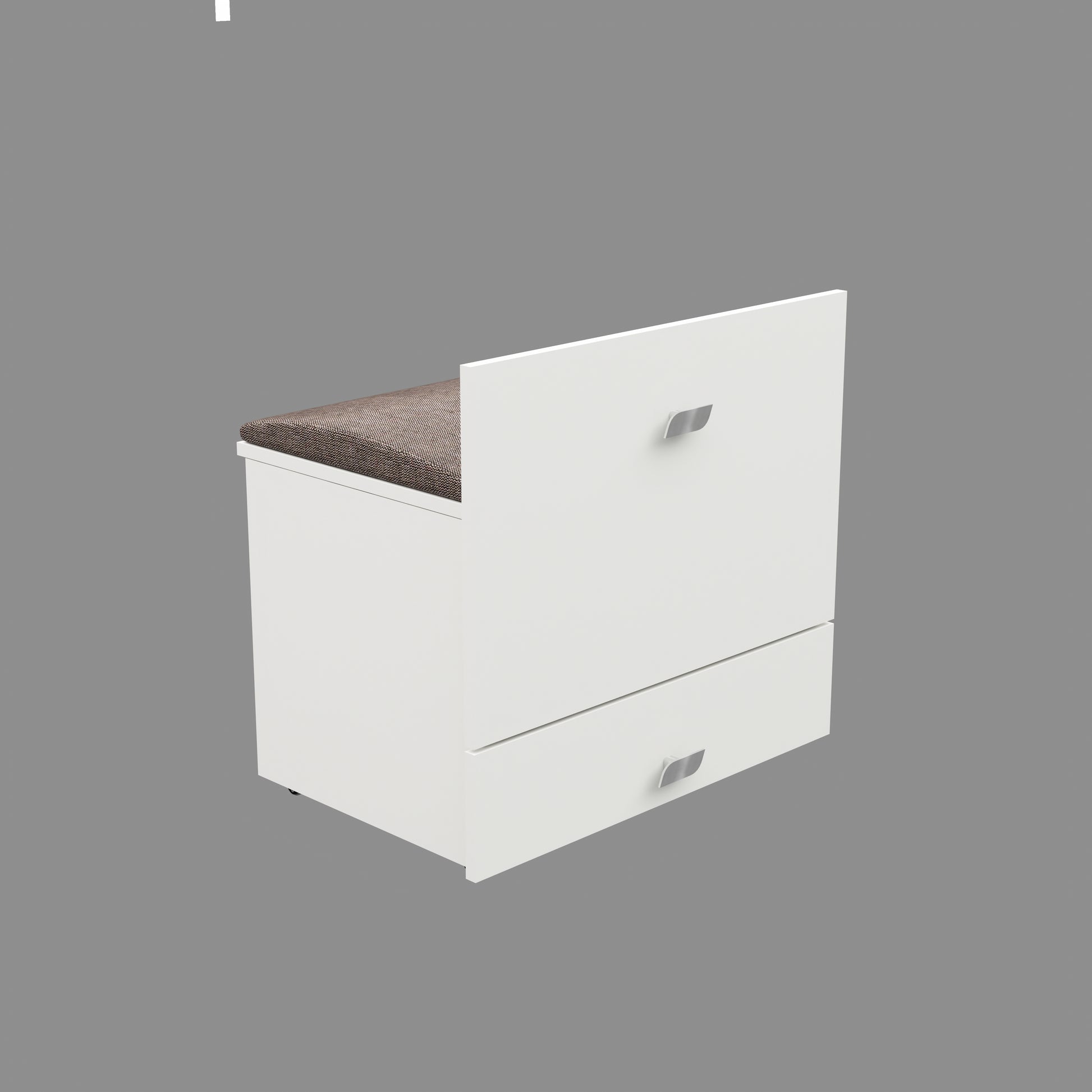 An ergonomic stool with cushioned seating, which also doubles as additional storage.